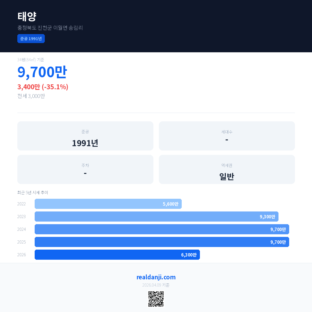 태양 국민평형 기준 2026년 평균 거래가는 6,300만으로, 전년 대비 35.1% 하락 했습니다.