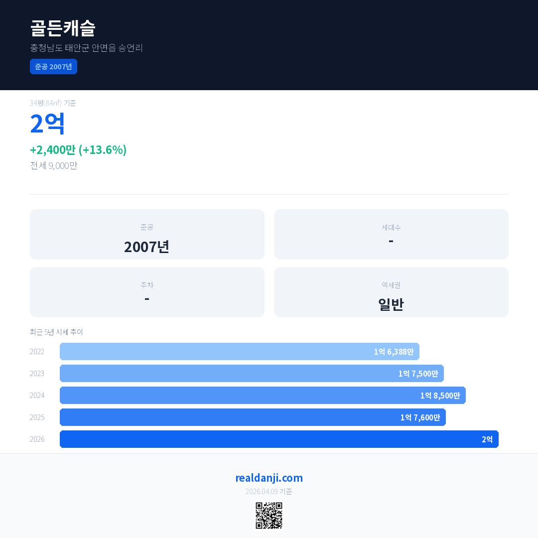 골든캐슬 국민평형 기준 2026년 평균 거래가는 2억으로, 전년 대비 13.6% 상승 했습니다.