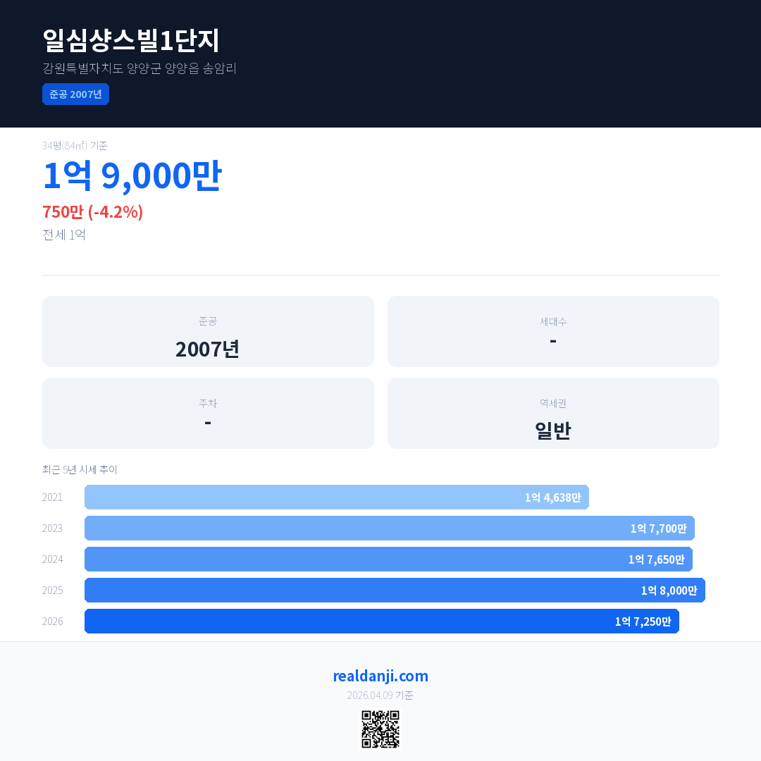 일심샹스빌1단지 국민평형 기준 2026년 평균 거래가는 1억 7,250만으로, 전년 대비 4.2% 하락 했습니다.