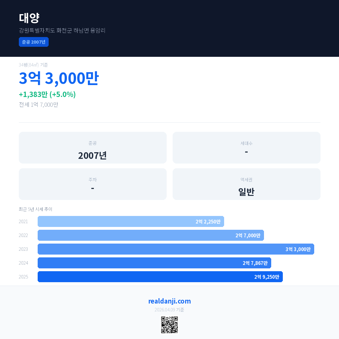 대양 국민평형 기준 2025년 평균 거래가는 2억 9,250만으로, 전년 대비 5.0% 상승 했습니다.