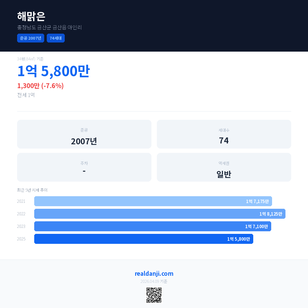 해맑은 국민평형 기준 2025년 평균 거래가는 1억 5,800만으로, 전년 대비 7.6% 하락 했습니다.