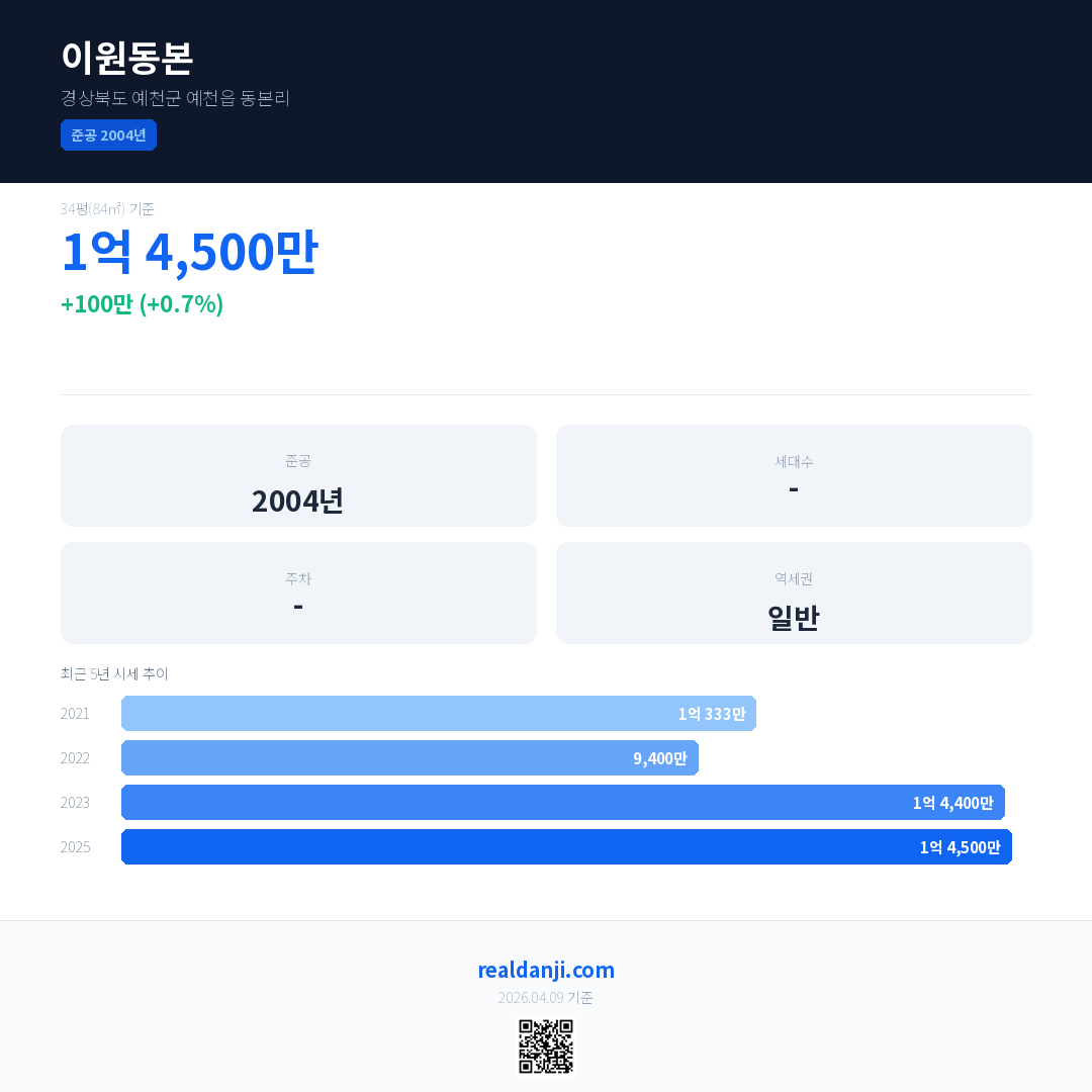 이원동본 국민평형 기준 2025년 평균 거래가는 1억 4,500만으로, 전년 대비 0.7% 상승 했습니다.