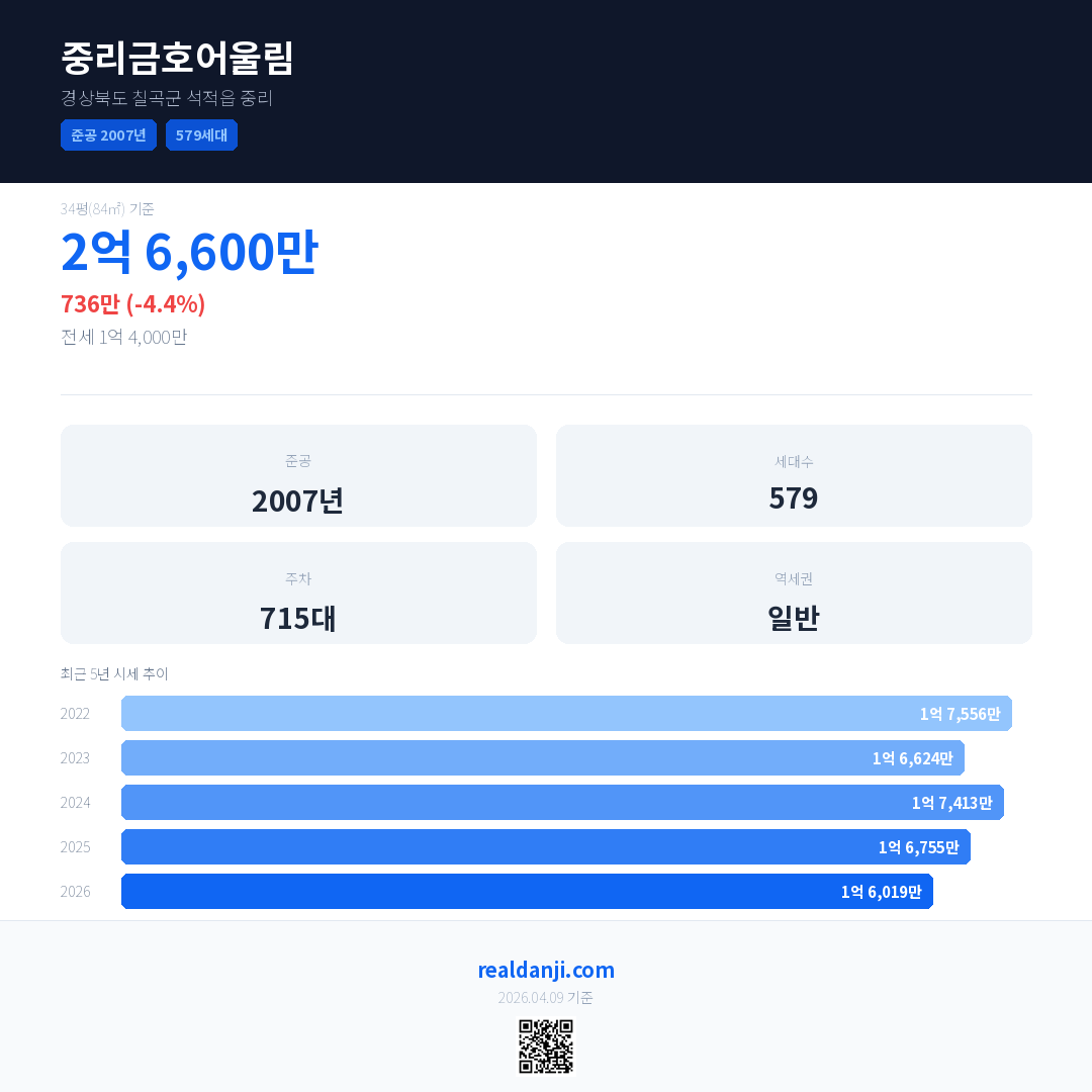 중리금호어울림 최근 거래가는 2억 6,600만입니다. (2026-04)