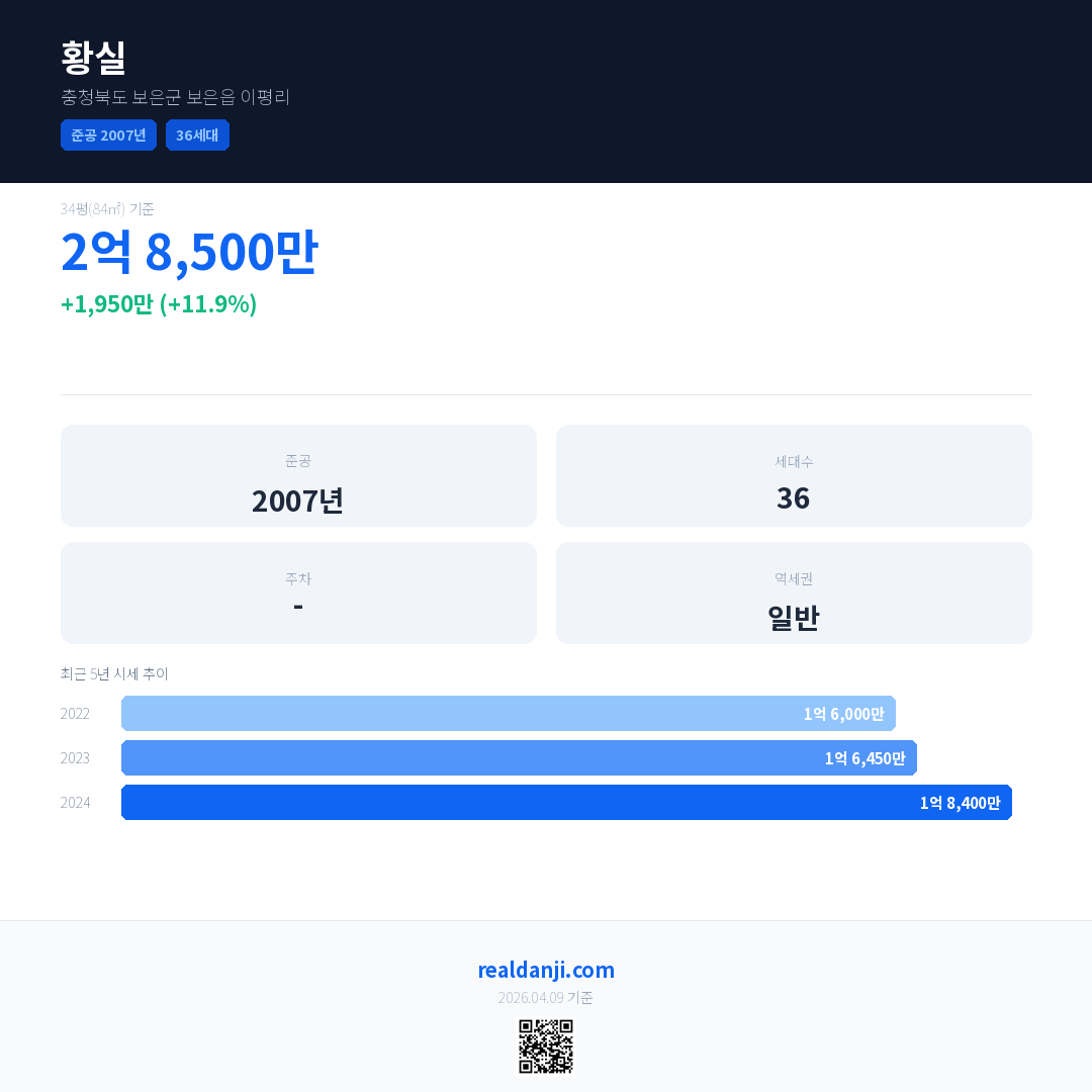 황실 국민평형 기준 2024년 평균 거래가는 1억 8,400만으로, 전년 대비 11.9% 상승 했습니다.