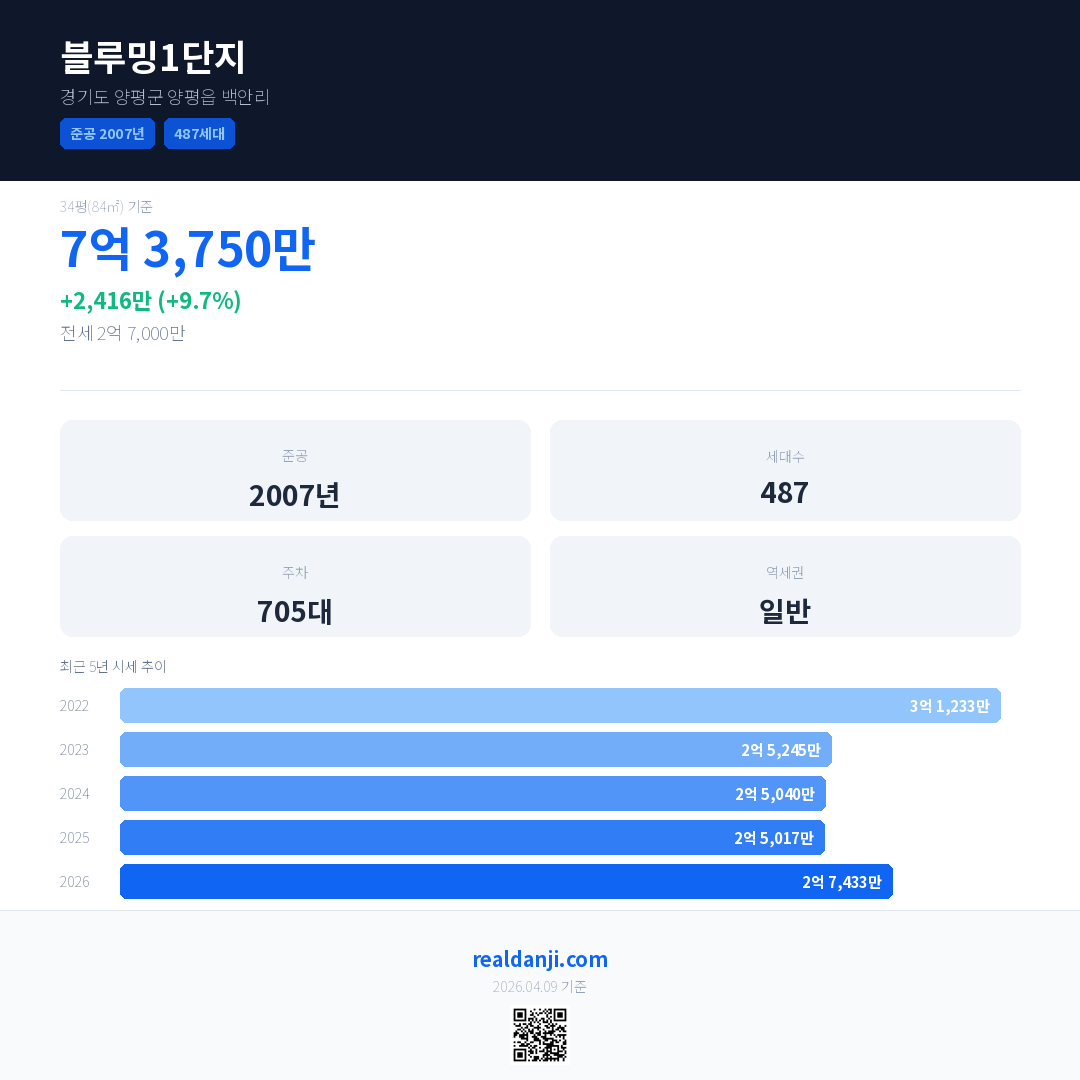 블루밍1단지은(는) 2007년에 준공되었으며, 현재 19년차입니다. 총 487세대 규모입니다.