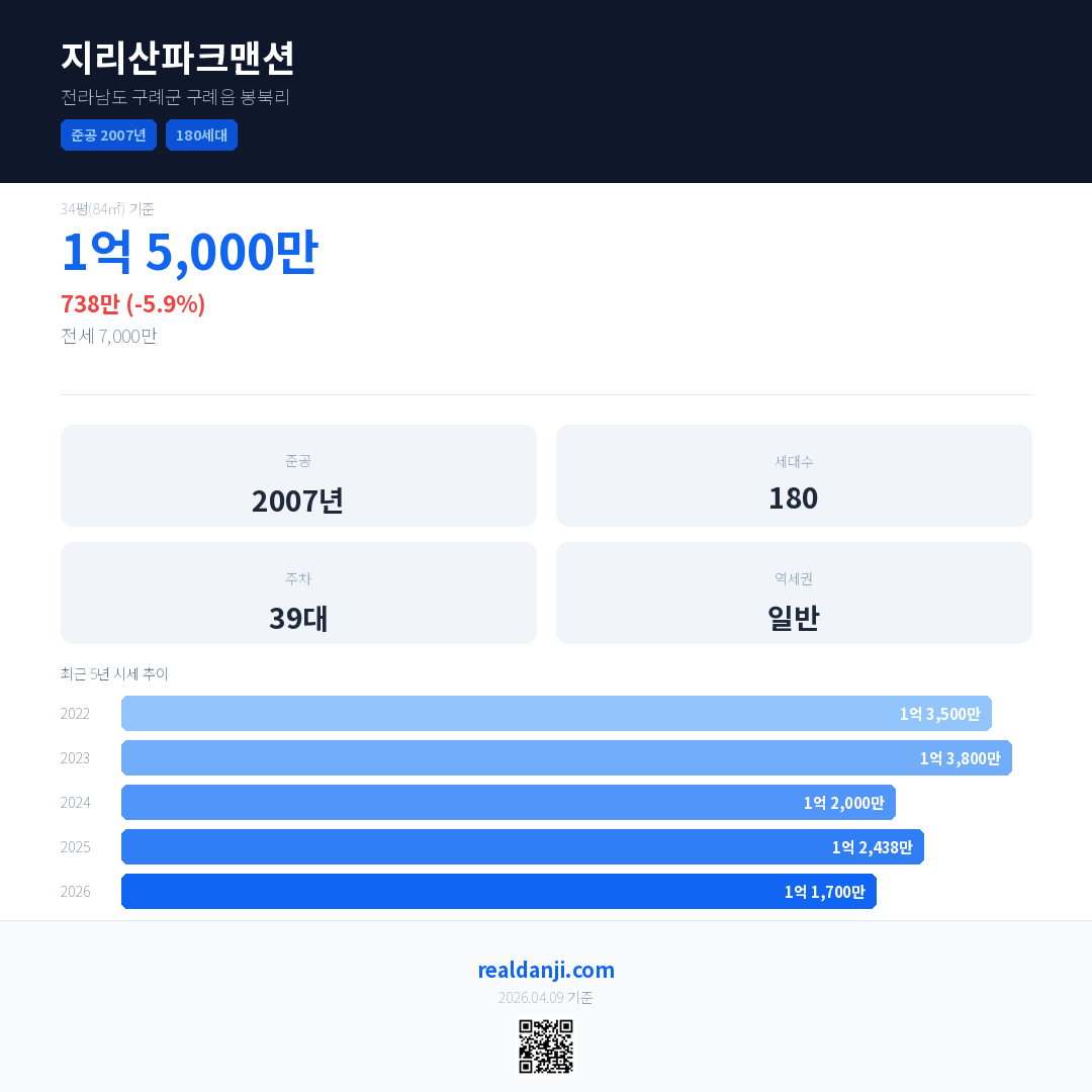 지리산파크맨션 국민평형 기준 2026년 평균 거래가는 1억 1,700만으로, 전년 대비 5.9% 하락 했습니다.