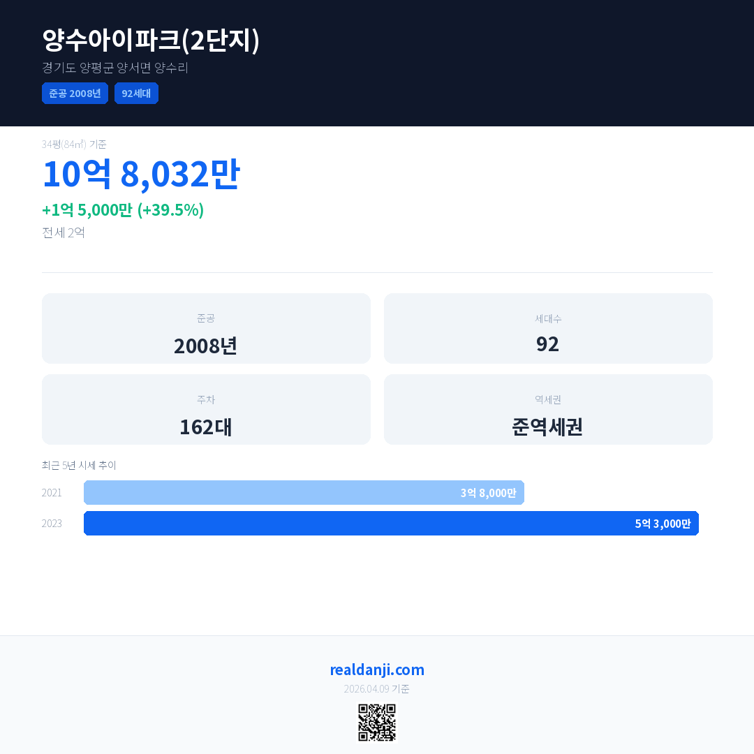 양수아이파크(2단지)은(는) 2008년에 준공되었으며, 현재 18년차입니다. 총 92세대 규모입니다.