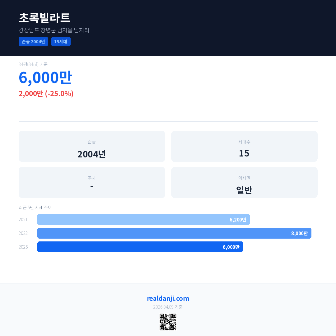 초록빌라트 국민평형 기준 2026년 평균 거래가는 6,000만으로, 전년 대비 25.0% 하락 했습니다.