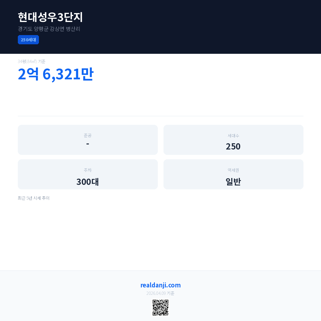 현대성우3단지 최근 거래가는 2억 6,321만입니다. (2012-04)