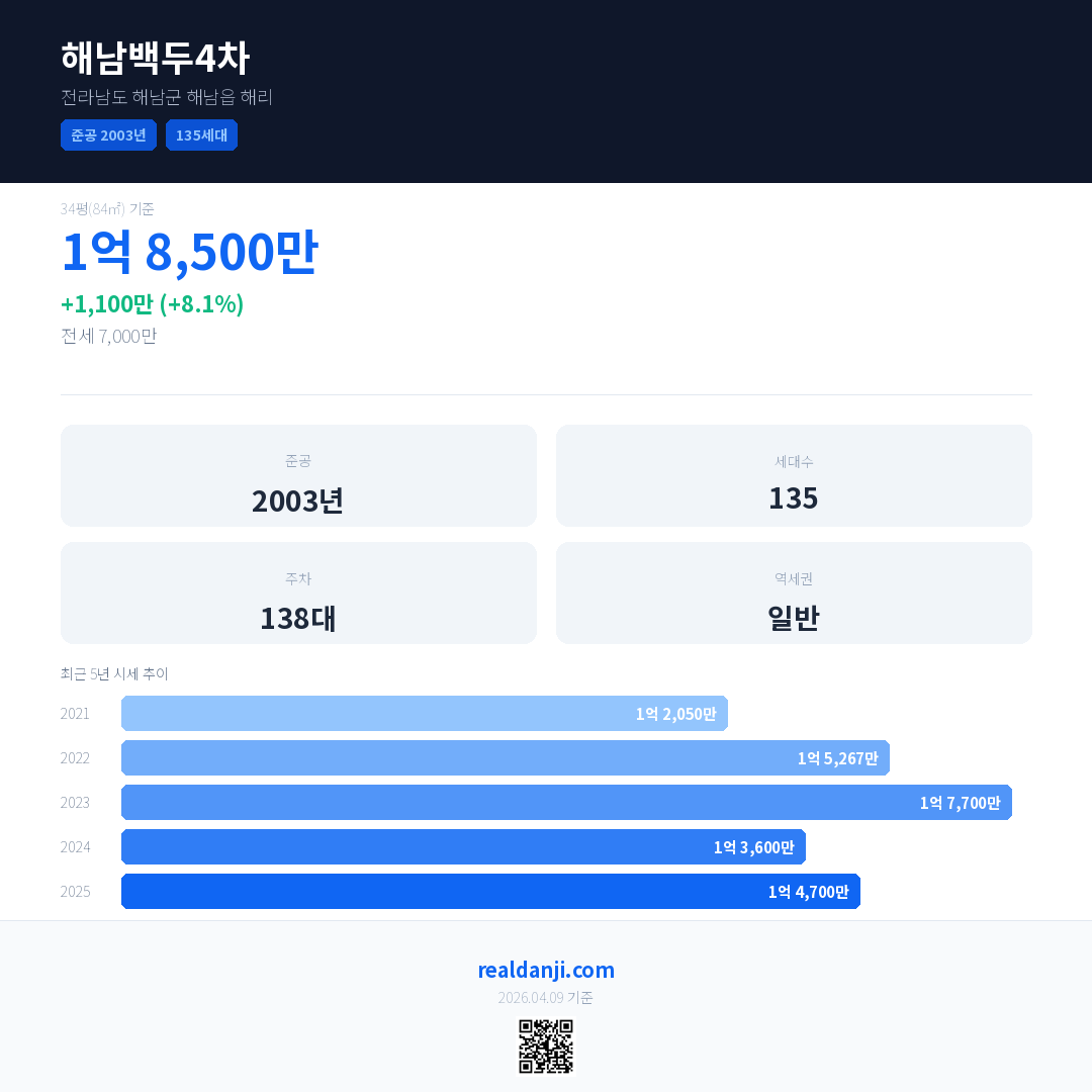해남백두4차 국민평형 기준 2025년 평균 거래가는 1억 4,700만으로, 전년 대비 8.1% 상승 했습니다.