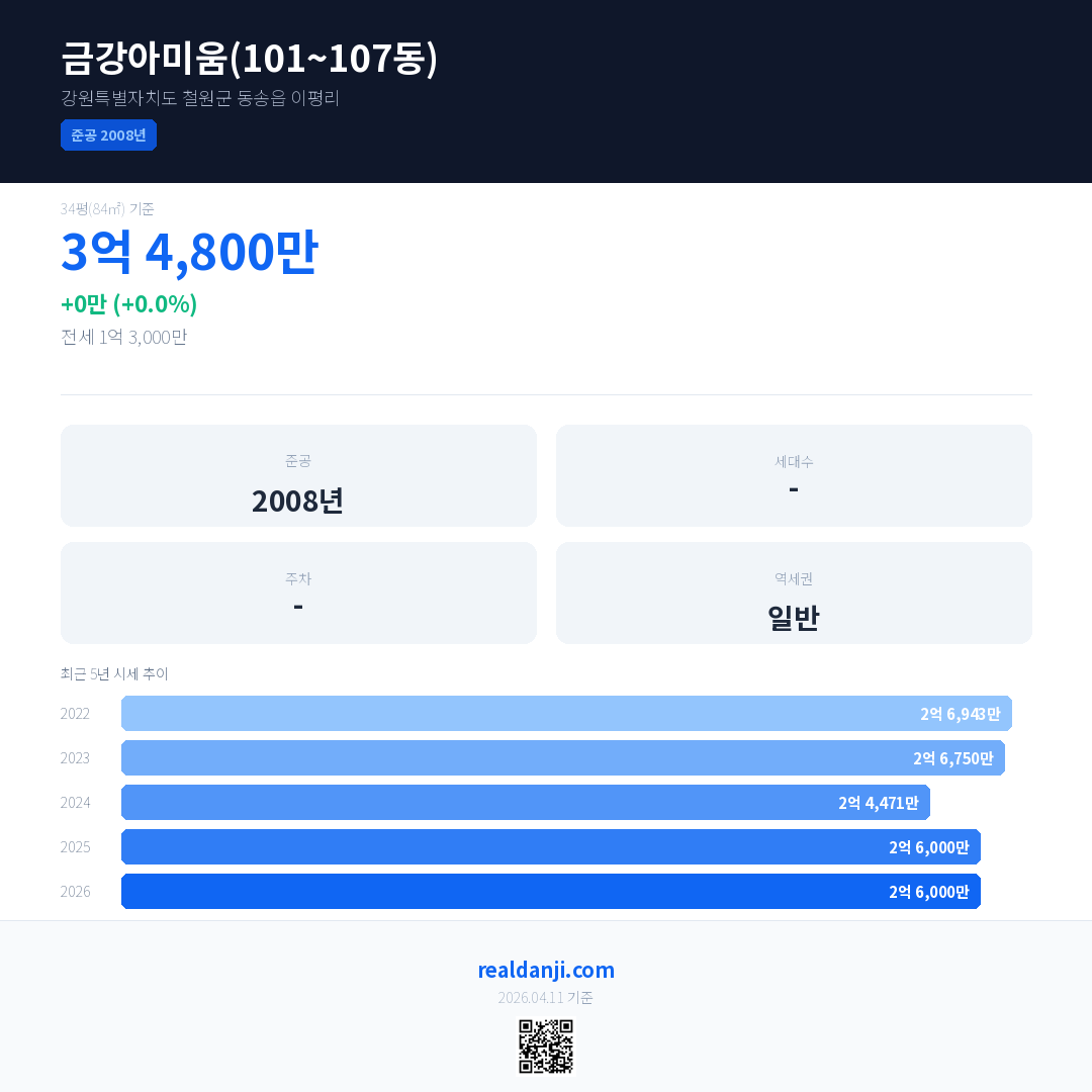 금강아미움(101~107동) 국민평형 기준 2026년 평균 거래가는 2억 6,000만으로, 전년 대비 0.0% 하락 했습니다.