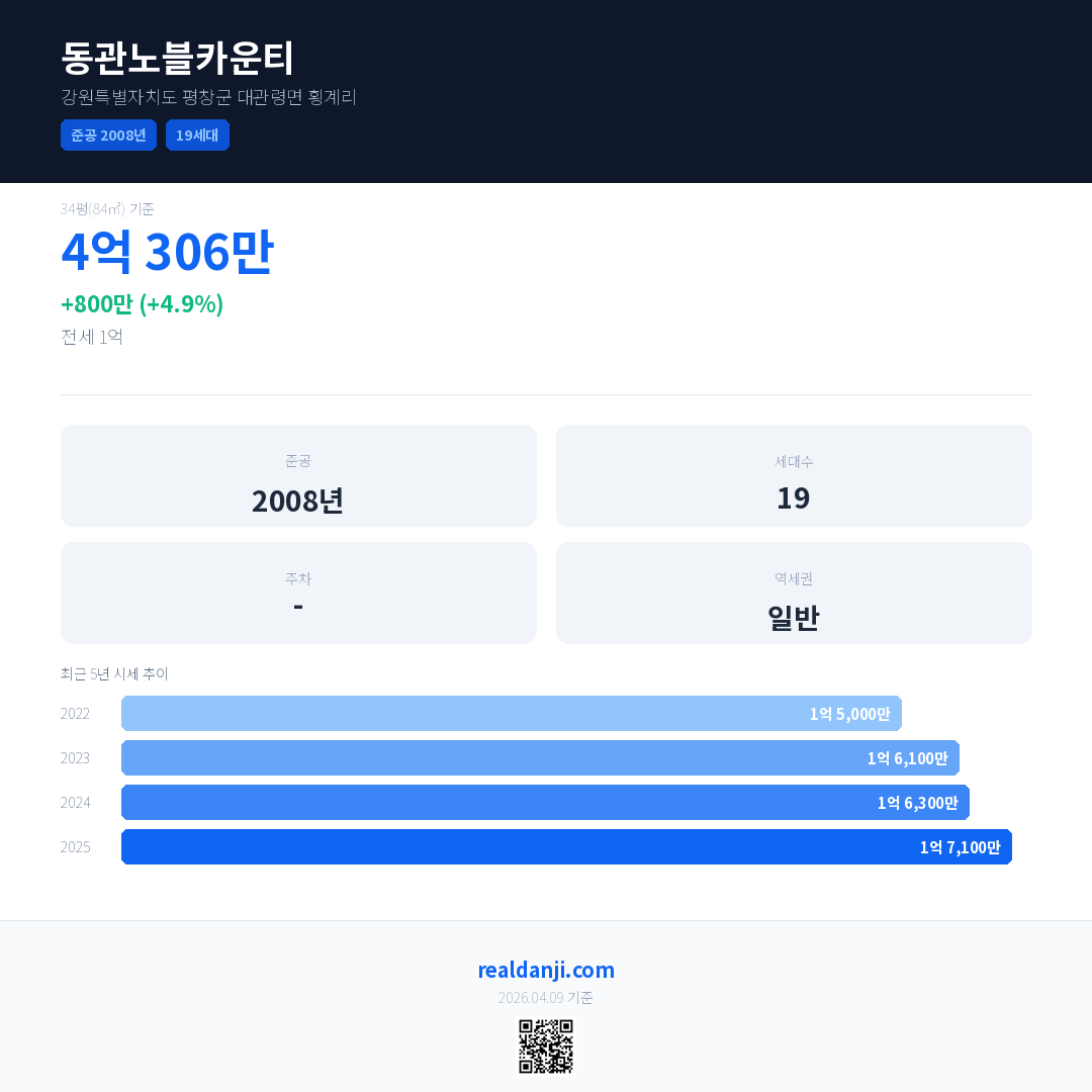 동관노블카운티 국민평형 기준 2025년 평균 거래가는 1억 7,100만으로, 전년 대비 4.9% 상승 했습니다.