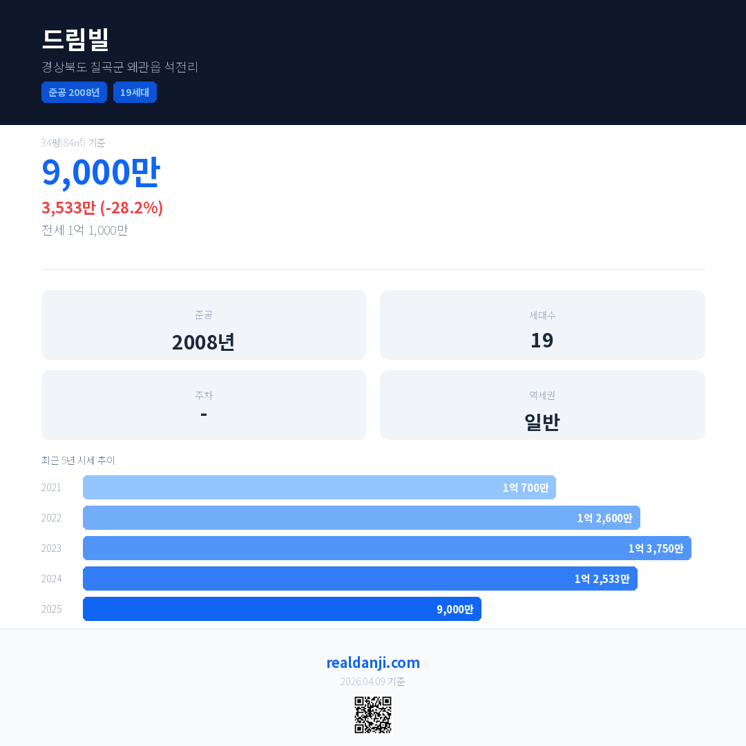 드림빌 국민평형 기준 2025년 평균 거래가는 9,000만으로, 전년 대비 28.2% 하락 했습니다.