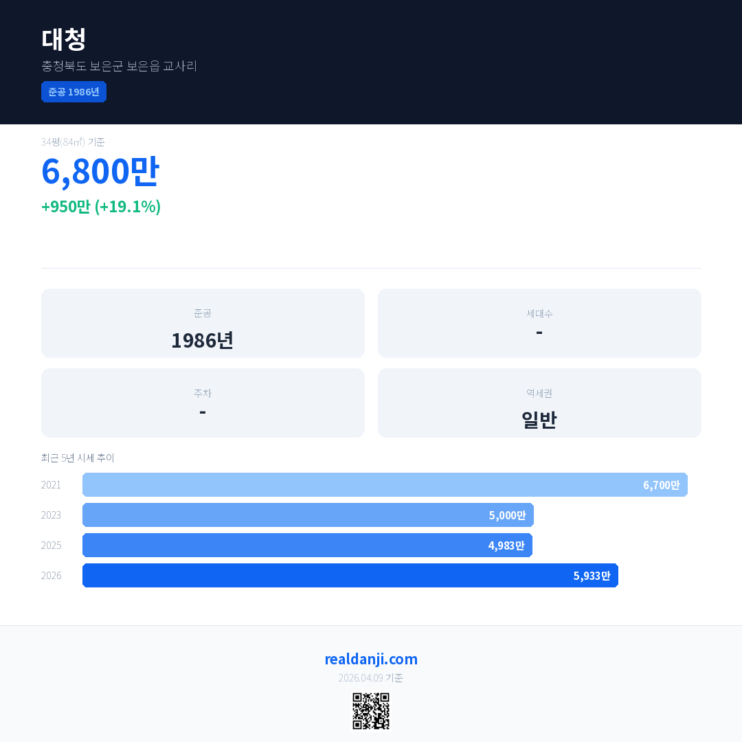 대청 국민평형 기준 2026년 평균 거래가는 5,933만으로, 전년 대비 19.1% 상승 했습니다.