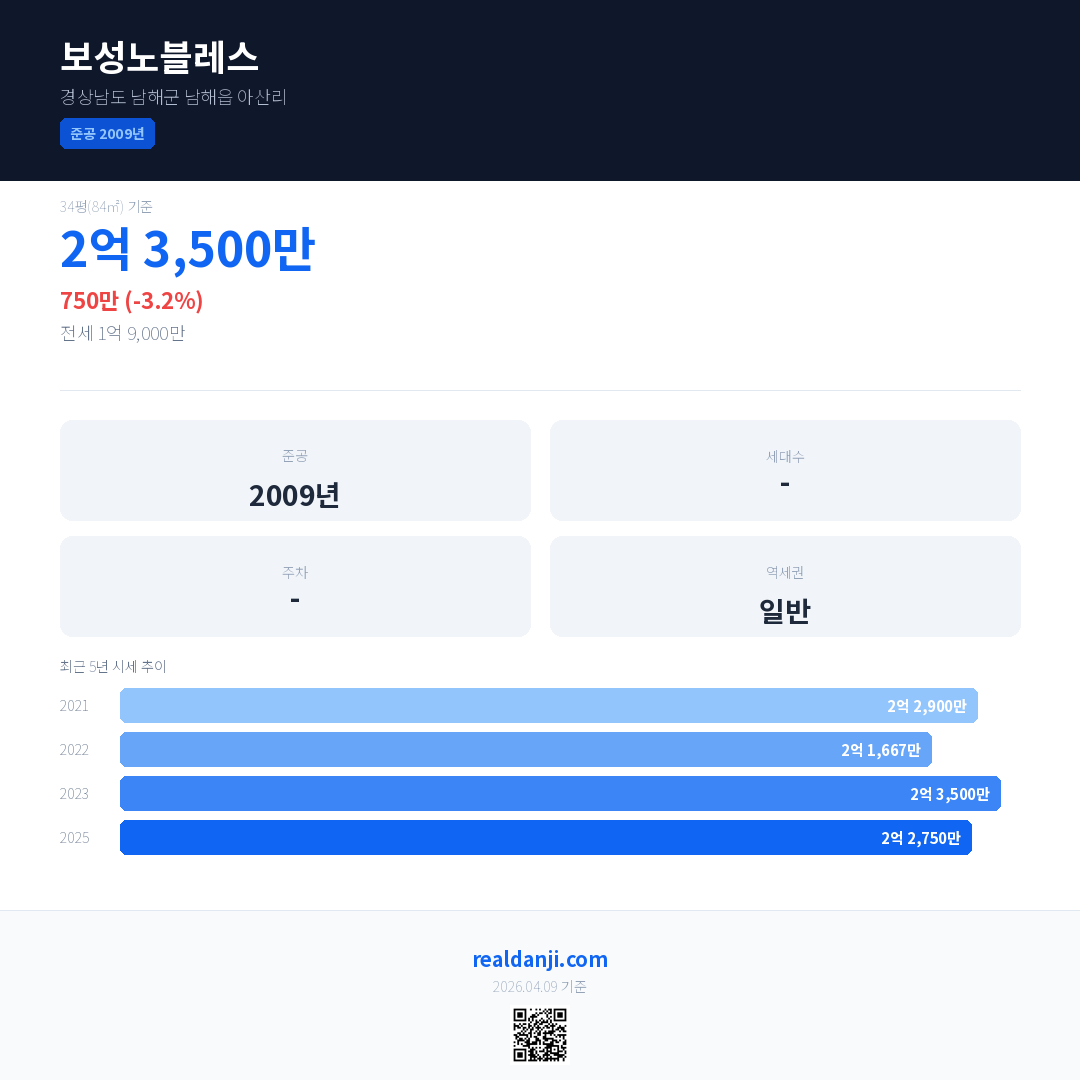 보성노블레스 국민평형 기준 2025년 평균 거래가는 2억 2,750만으로, 전년 대비 3.2% 하락 했습니다.