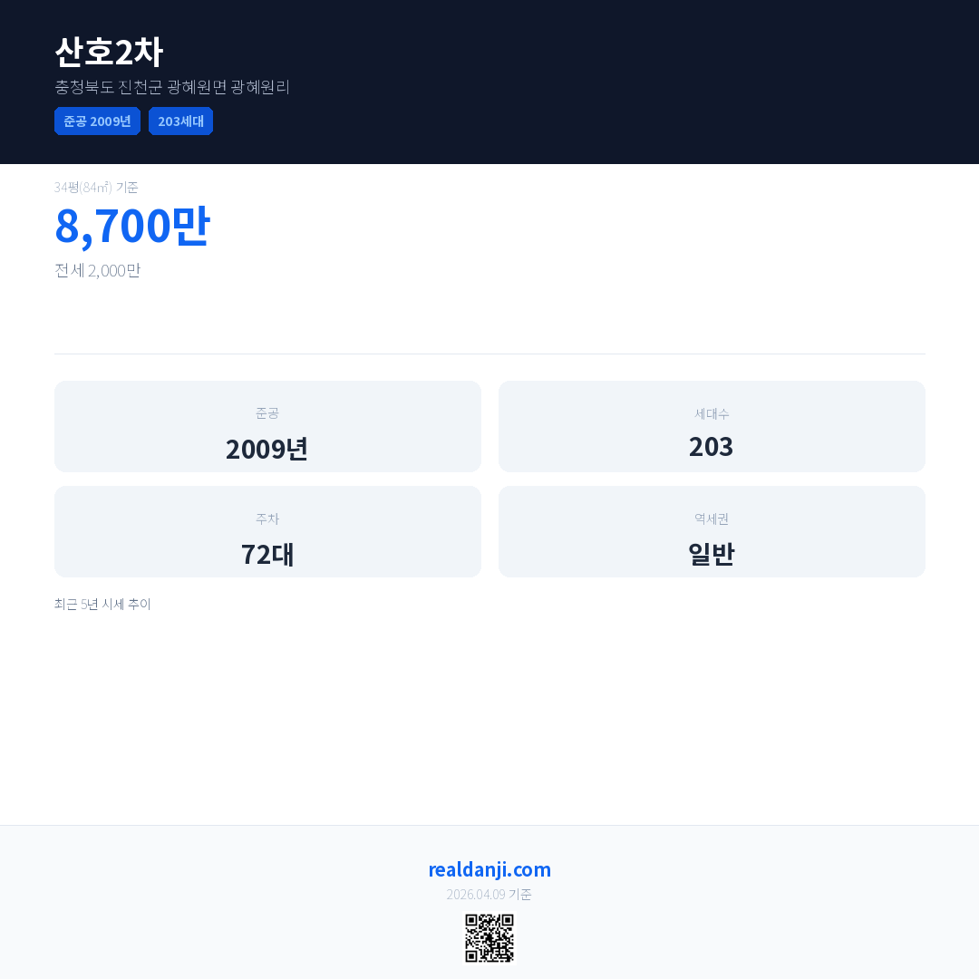 산호2차은(는) 2009년에 준공되었으며, 현재 17년차입니다. 총 203세대 규모입니다.