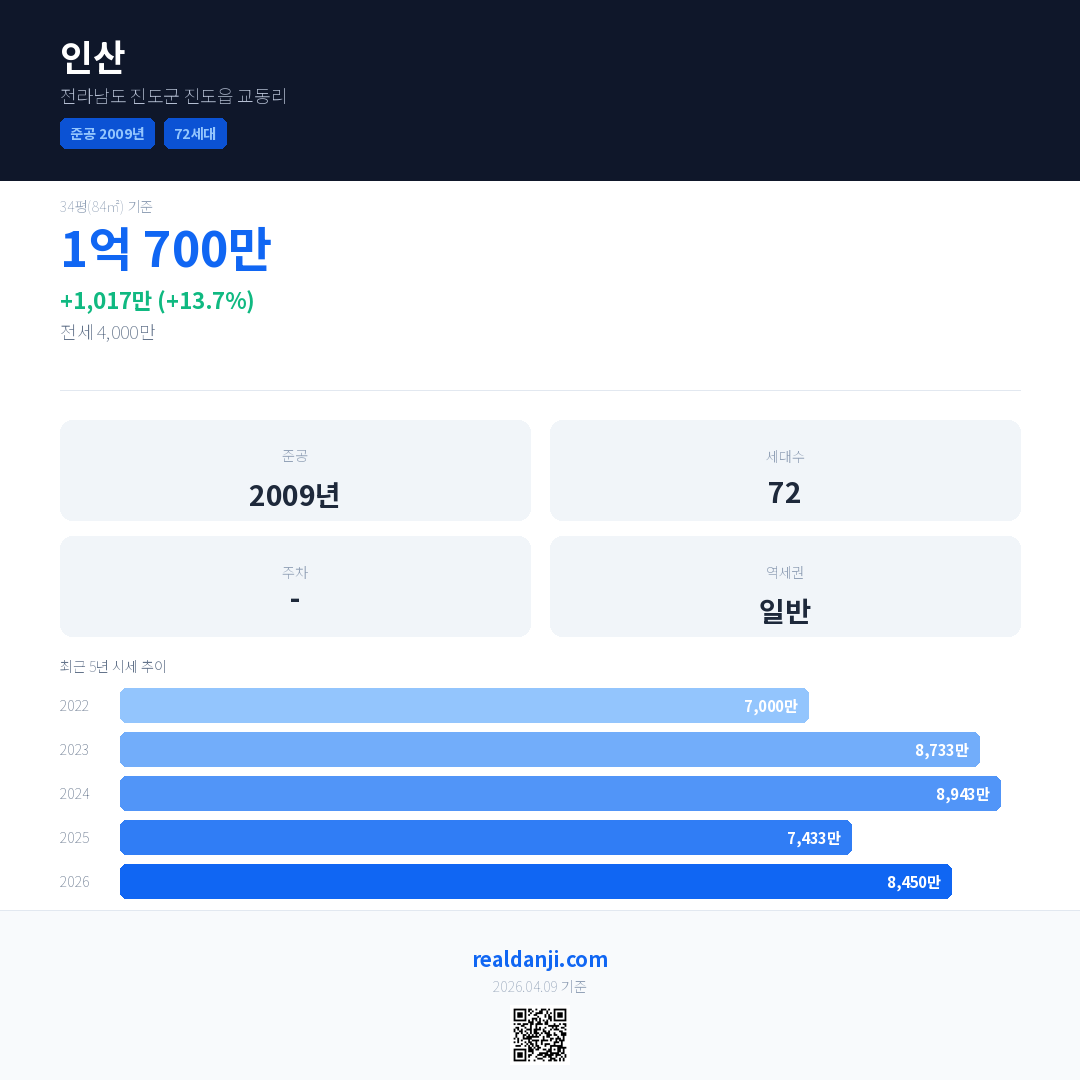 인산 국민평형 기준 2026년 평균 거래가는 8,450만으로, 전년 대비 13.7% 상승 했습니다.