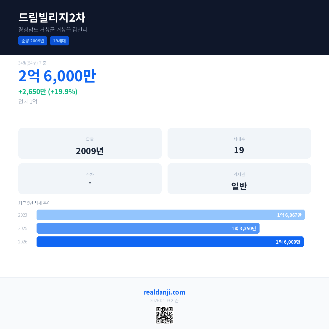 드림빌리지2차 국민평형 기준 2026년 평균 거래가는 1억 6,000만으로, 전년 대비 19.9% 상승 했습니다.