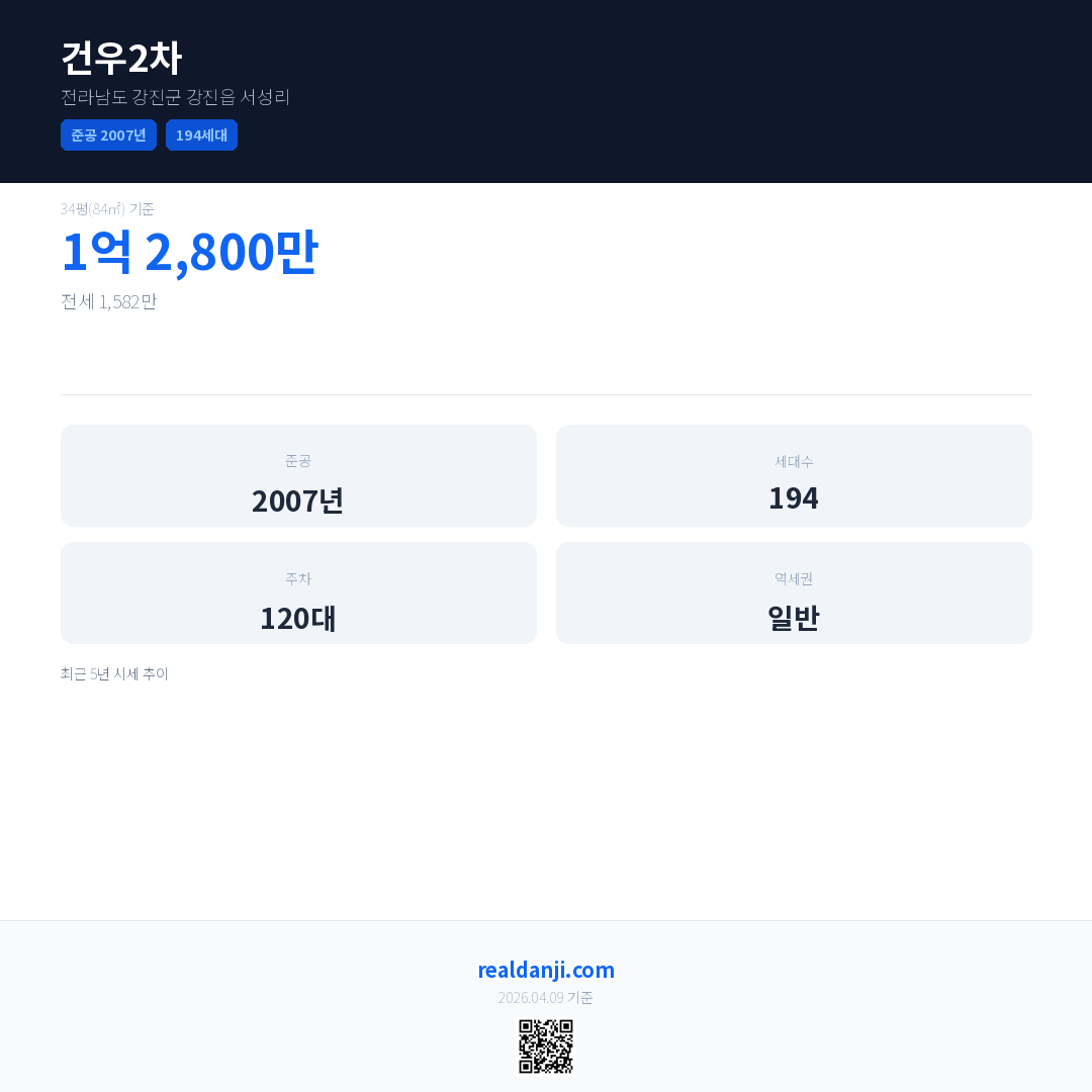 건우2차은(는) 2007년에 준공되었으며, 현재 19년차입니다. 총 194세대 규모입니다.