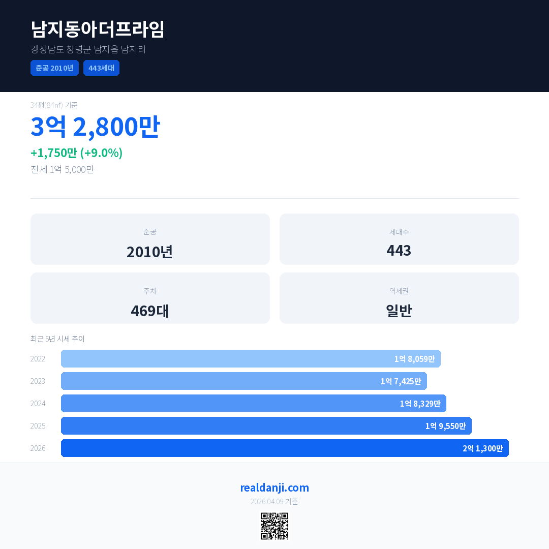 남지동아더프라임 국민평형 기준 2026년 평균 거래가는 2억 1,300만으로, 전년 대비 9.0% 상승 했습니다.