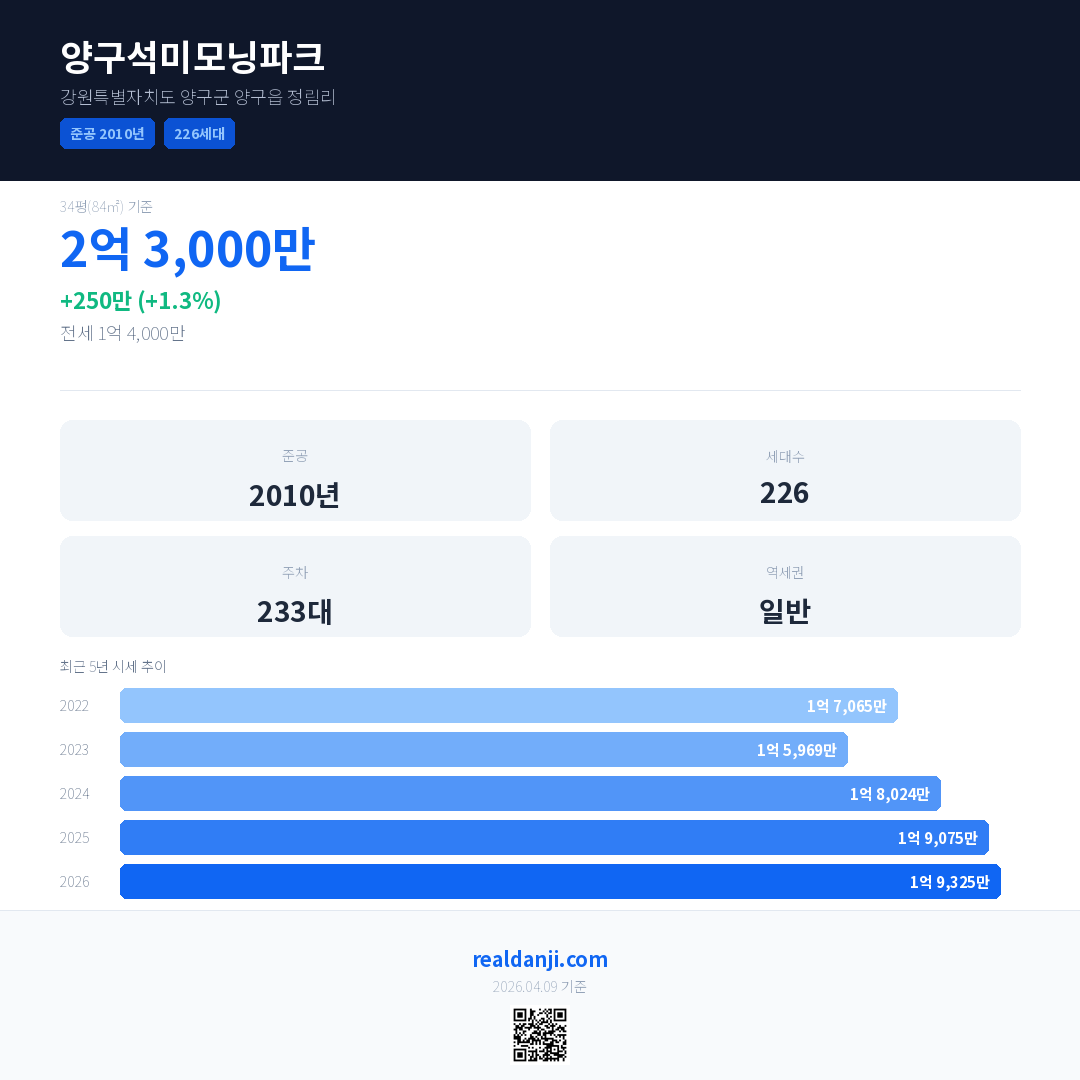 양구석미모닝파크 최근 거래가는 2억 3,000만입니다. (2026-03)