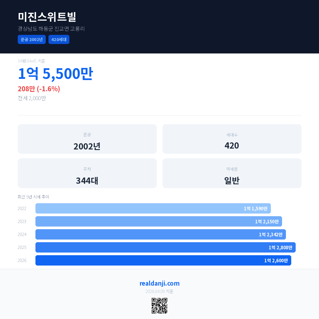 미진스위트빌 국민평형 기준 2026년 평균 거래가는 1억 2,600만으로, 전년 대비 1.6% 하락 했습니다.