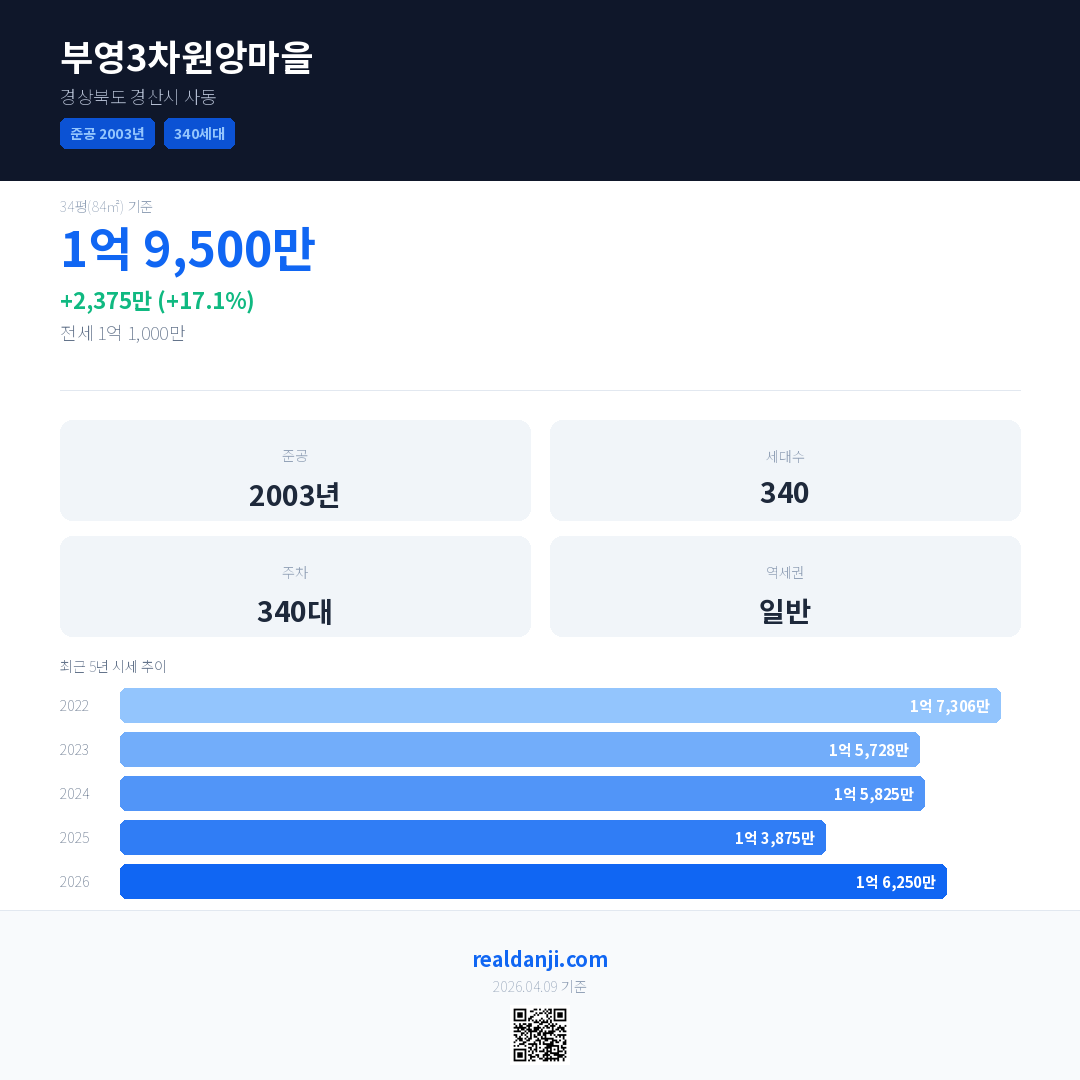 부영3차원앙마을 국민평형 기준 2026년 평균 거래가는 1억 6,250만으로, 전년 대비 17.1% 상승 했습니다.