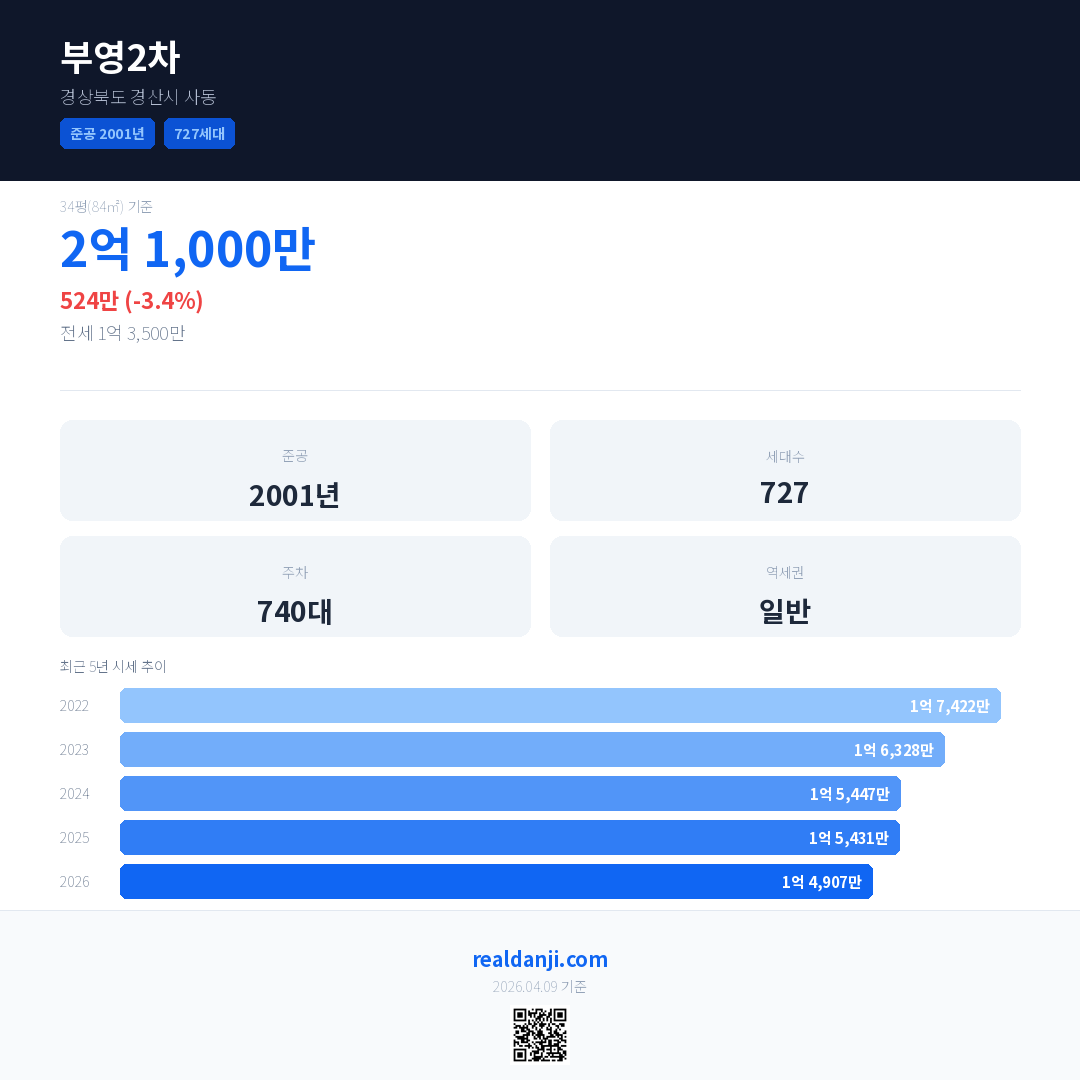 부영2차은(는) 2001년에 준공되었으며, 현재 25년차입니다. 총 727세대 규모입니다.