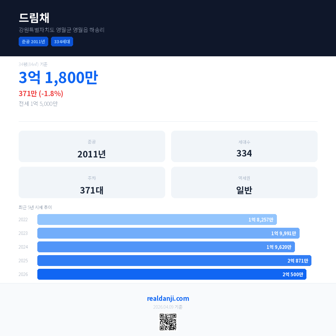 드림채 국민평형 기준 2026년 평균 거래가는 2억 500만으로, 전년 대비 1.8% 하락 했습니다.