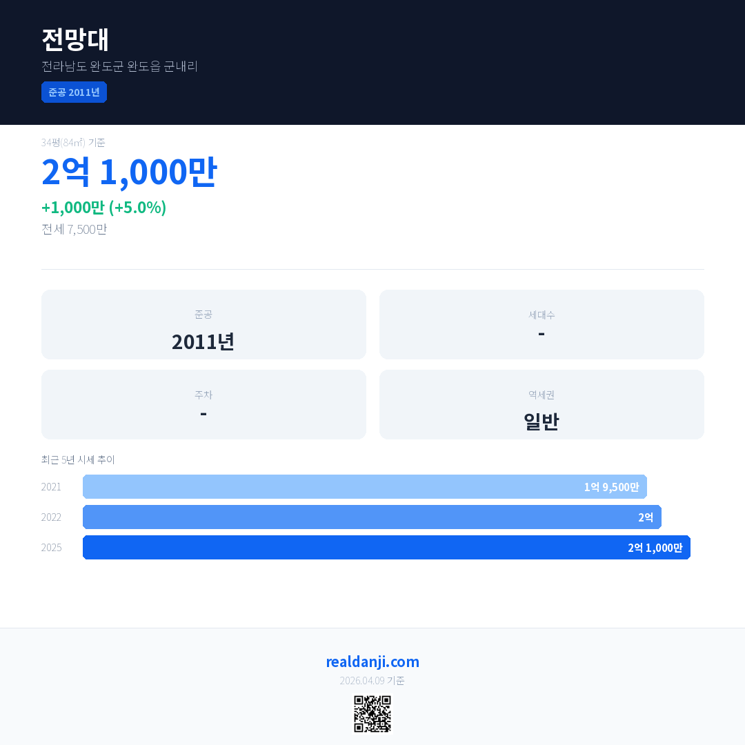 전망대 국민평형 기준 2025년 평균 거래가는 2억 1,000만으로, 전년 대비 5.0% 상승 했습니다.