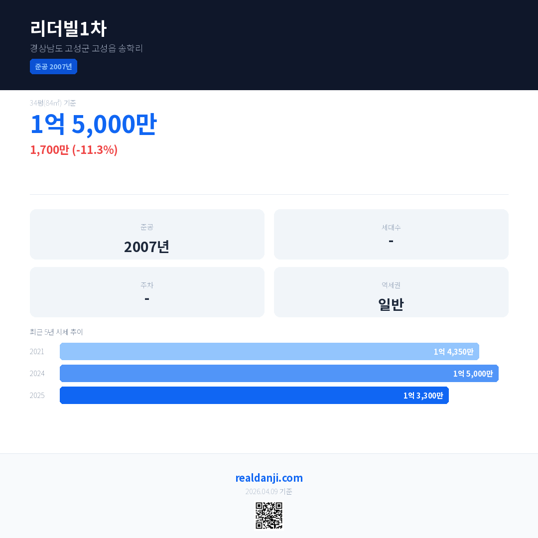 리더빌1차 국민평형 기준 2025년 평균 거래가는 1억 3,300만으로, 전년 대비 11.3% 하락 했습니다.