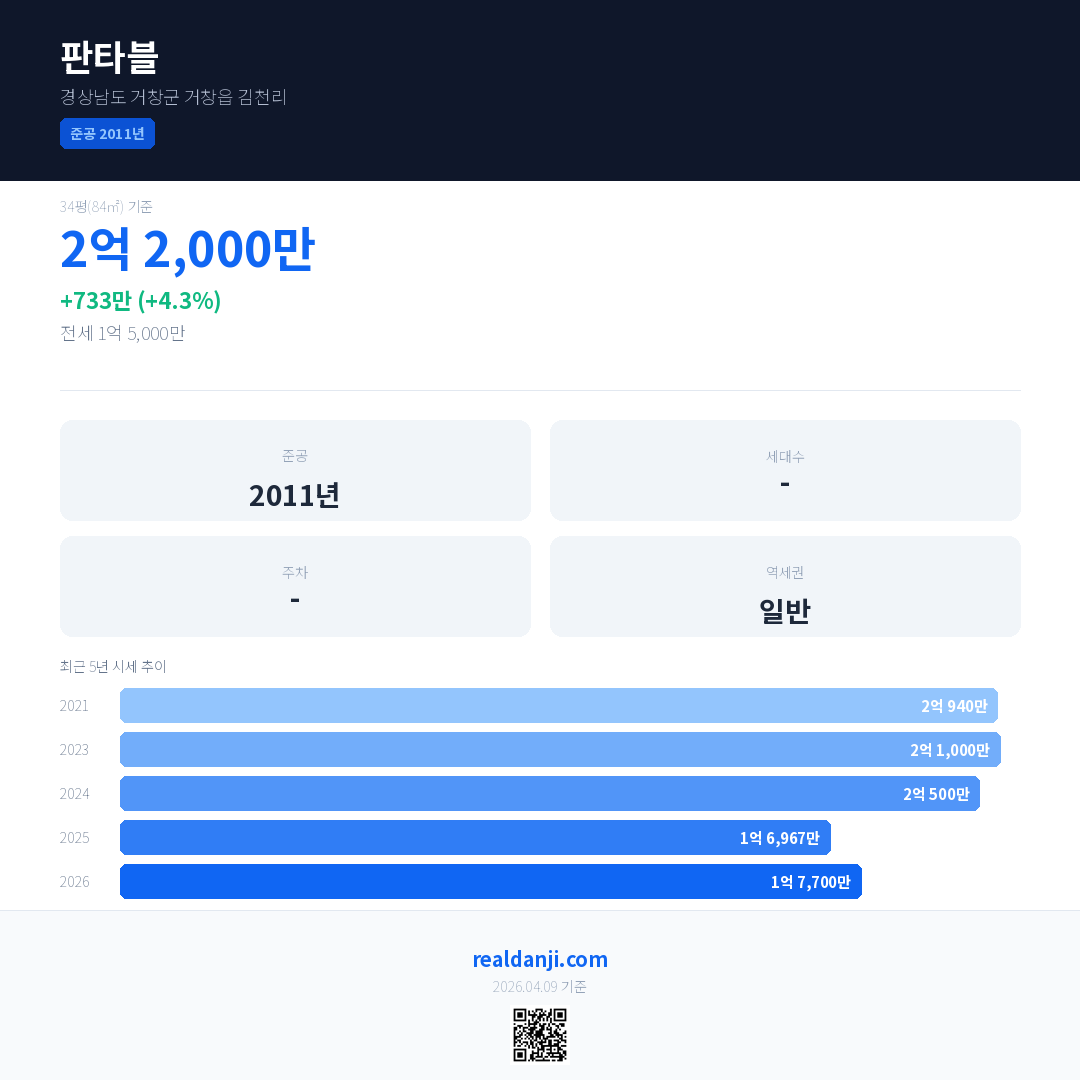 판타블 국민평형 기준 2026년 평균 거래가는 1억 7,700만으로, 전년 대비 4.3% 상승 했습니다.