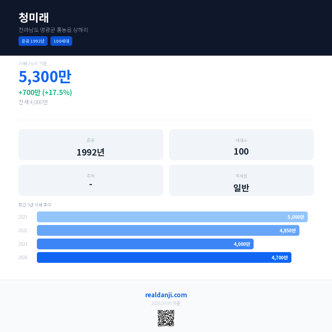 청미래 국민평형 기준 2026년 평균 거래가는 4,700만으로, 전년 대비 17.5% 상승 했습니다.