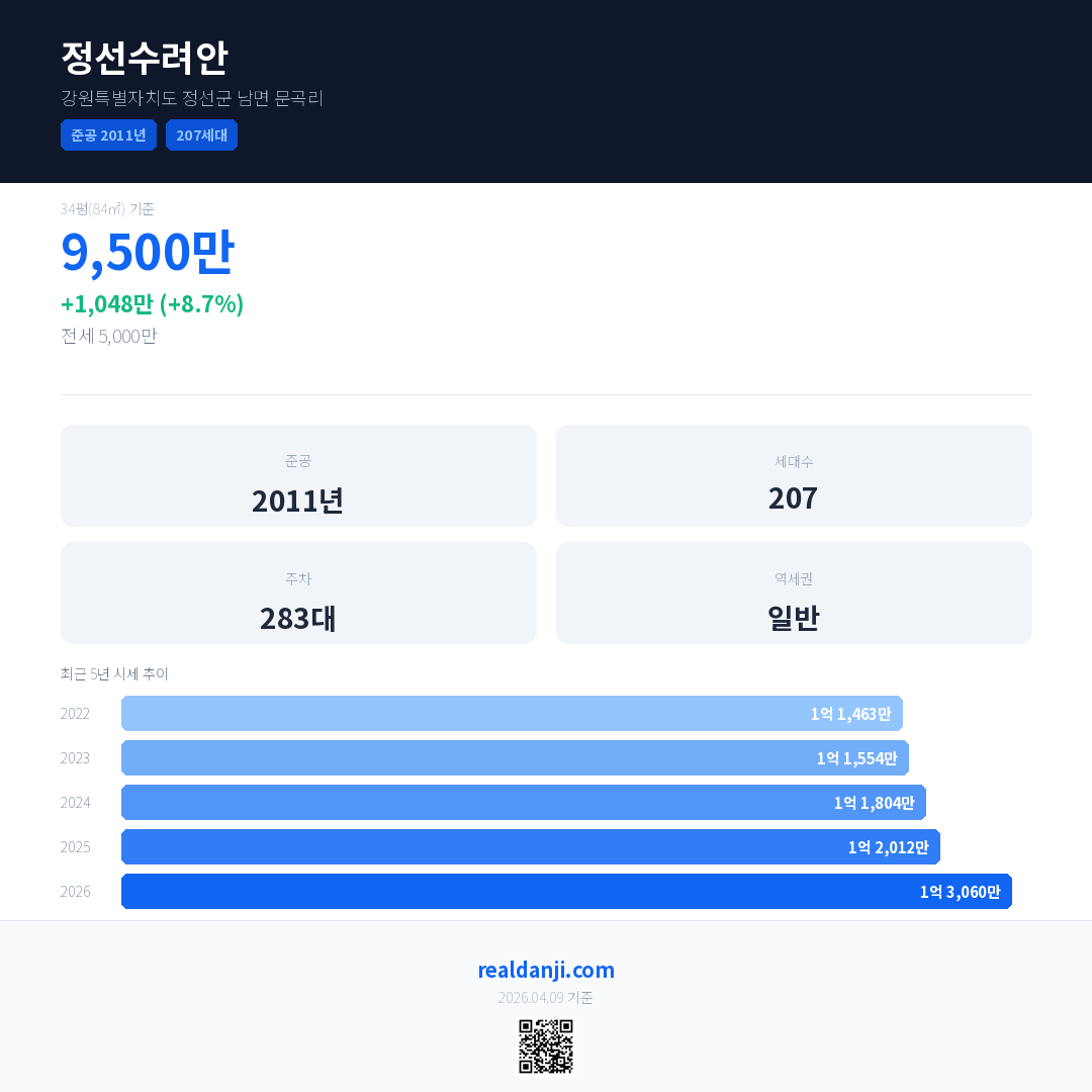 정선수려안은(는) 2011년에 준공되었으며, 현재 15년차입니다. 총 207세대 규모입니다.