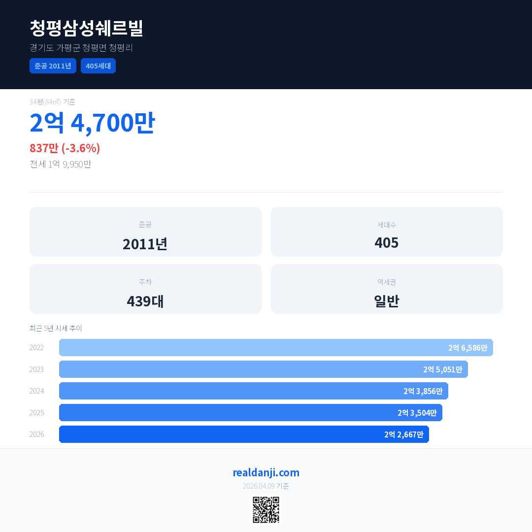 청평삼성쉐르빌 국민평형 기준 2026년 평균 거래가는 2억 2,667만으로, 전년 대비 3.6% 하락 했습니다.
