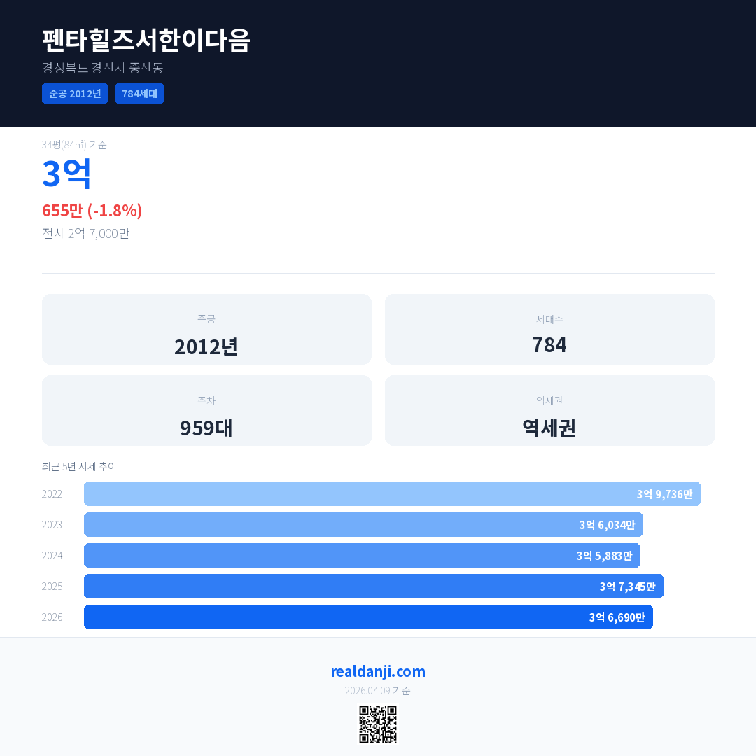 펜타힐즈서한이다음 국민평형 기준 2026년 평균 거래가는 3억 6,690만으로, 전년 대비 1.8% 하락 했습니다.