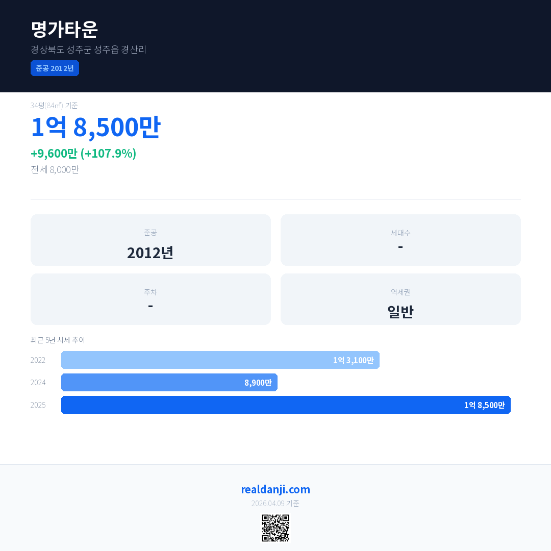 명가타운 국민평형 기준 2025년 평균 거래가는 1억 8,500만으로, 전년 대비 107.9% 상승 했습니다.