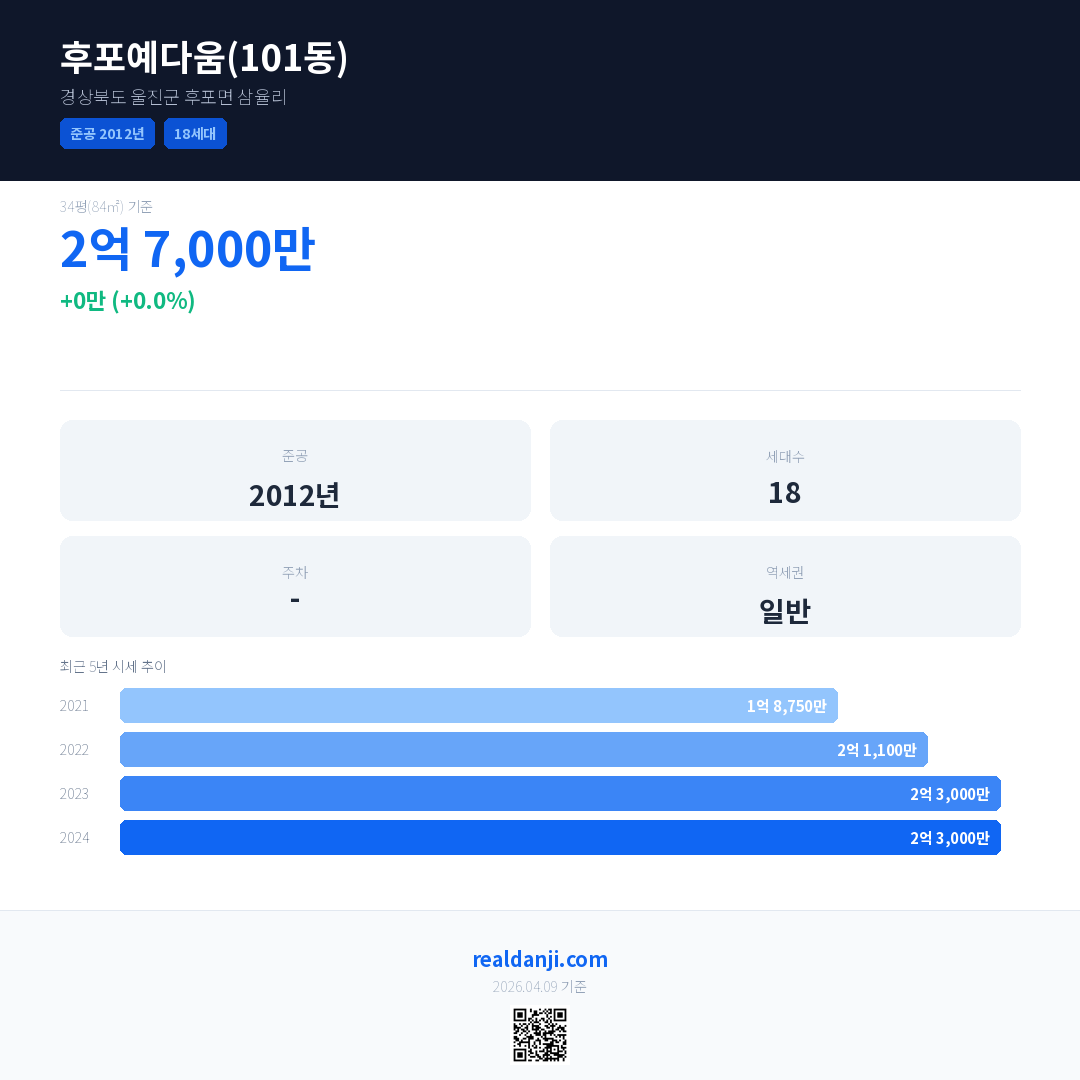 후포예다움(101동) 최근 거래가는 2억 7,000만입니다. (2024-09)