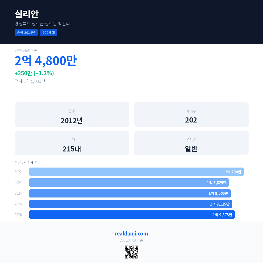 실리안 국민평형 기준 2026년 평균 거래가는 1억 9,375만으로, 전년 대비 1.3% 상승 했습니다.