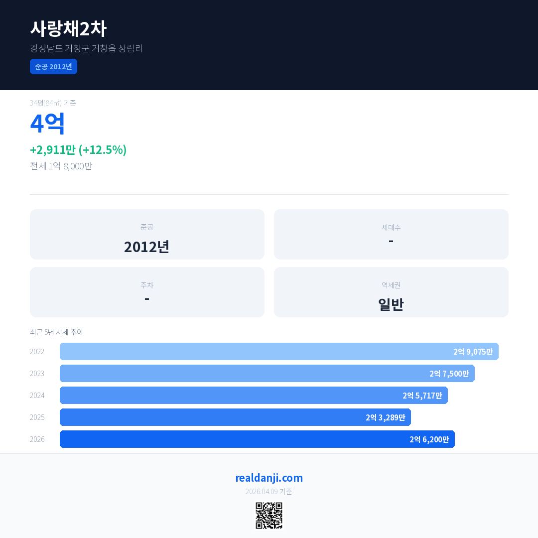 사랑채2차 국민평형 기준 2026년 평균 거래가는 2억 6,200만으로, 전년 대비 12.5% 상승 했습니다.