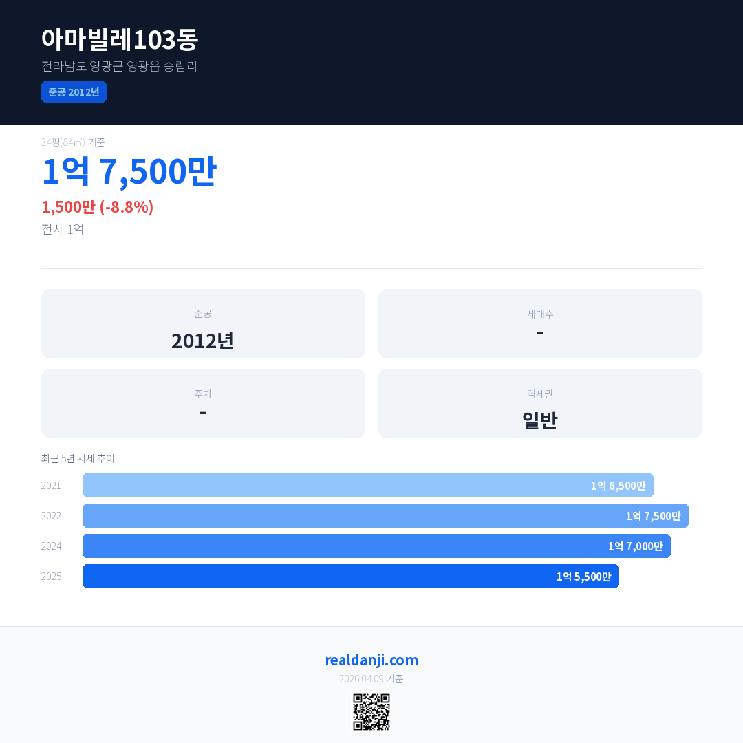 아마빌레103동 국민평형 기준 2025년 평균 거래가는 1억 5,500만으로, 전년 대비 8.8% 하락 했습니다.