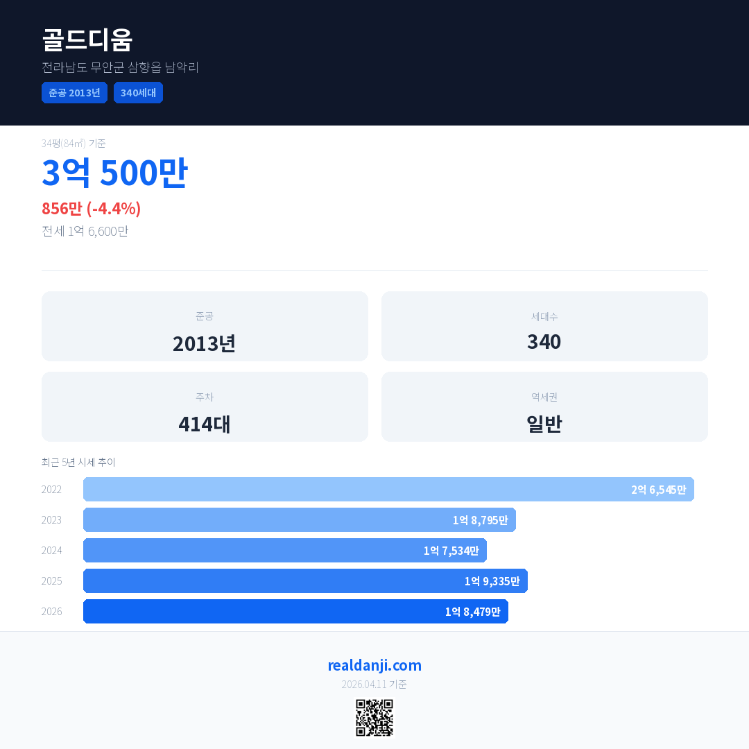 골드디움 국민평형 기준 2026년 평균 거래가는 1억 8,479만으로, 전년 대비 4.4% 하락 했습니다.