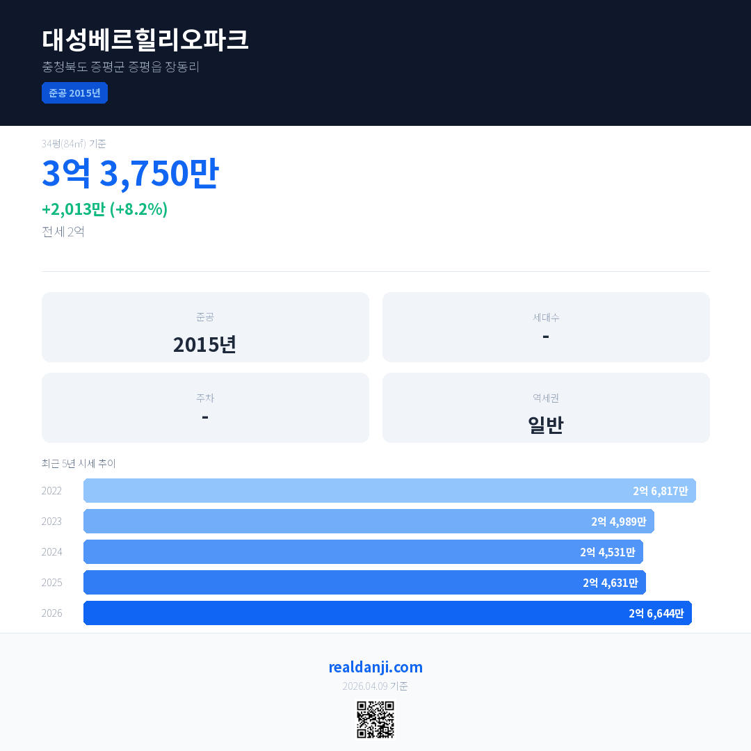 대성베르힐리오파크 국민평형 기준 2026년 평균 거래가는 2억 6,644만으로, 전년 대비 8.2% 상승 했습니다.