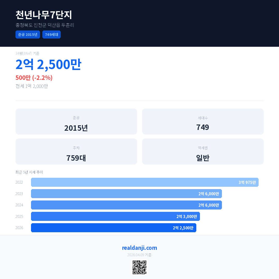 천년나무7단지 국민평형 기준 2026년 평균 거래가는 2억 2,500만으로, 전년 대비 2.2% 하락 했습니다.
