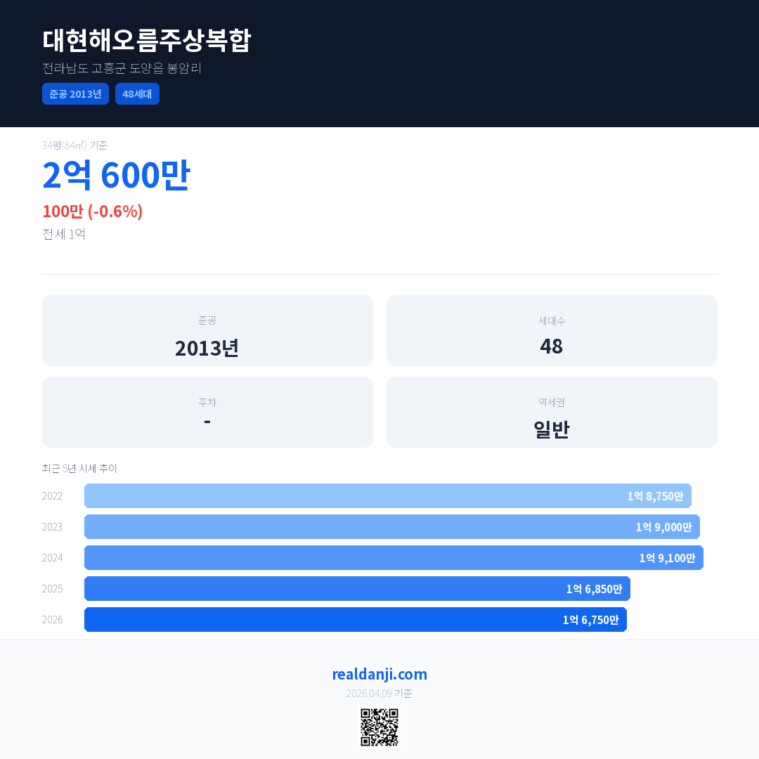 대현해오름주상복합 최근 거래가는 2억 600만입니다. (2026-02)