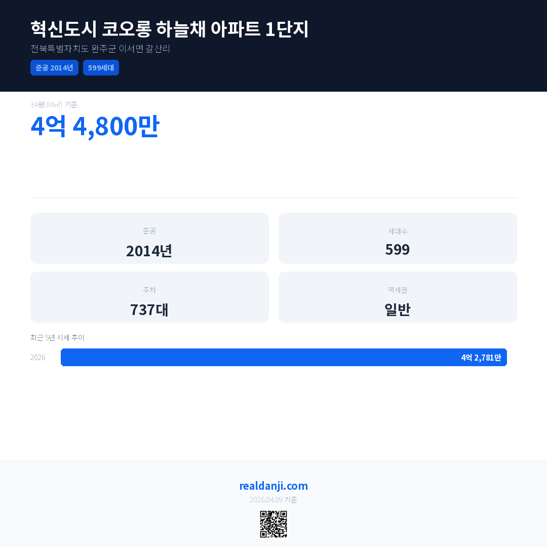 혁신도시 코오롱 하늘채 아파트 1단지 최근 거래가는 4억 3,000만입니다. (2026-04)