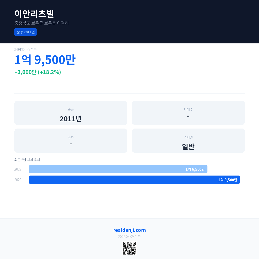 이안리츠빌 국민평형 기준 2023년 평균 거래가는 1억 9,500만으로, 전년 대비 18.2% 상승 했습니다.