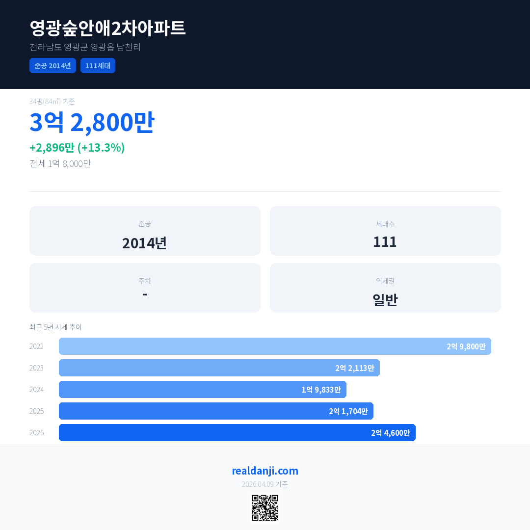 영광숲안애2차아파트 최근 거래가는 1억 2,800만입니다. (2026-03)