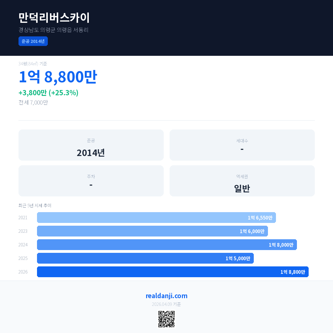 만덕리버스카이 국민평형 기준 2026년 평균 거래가는 1억 8,800만으로, 전년 대비 25.3% 상승 했습니다.