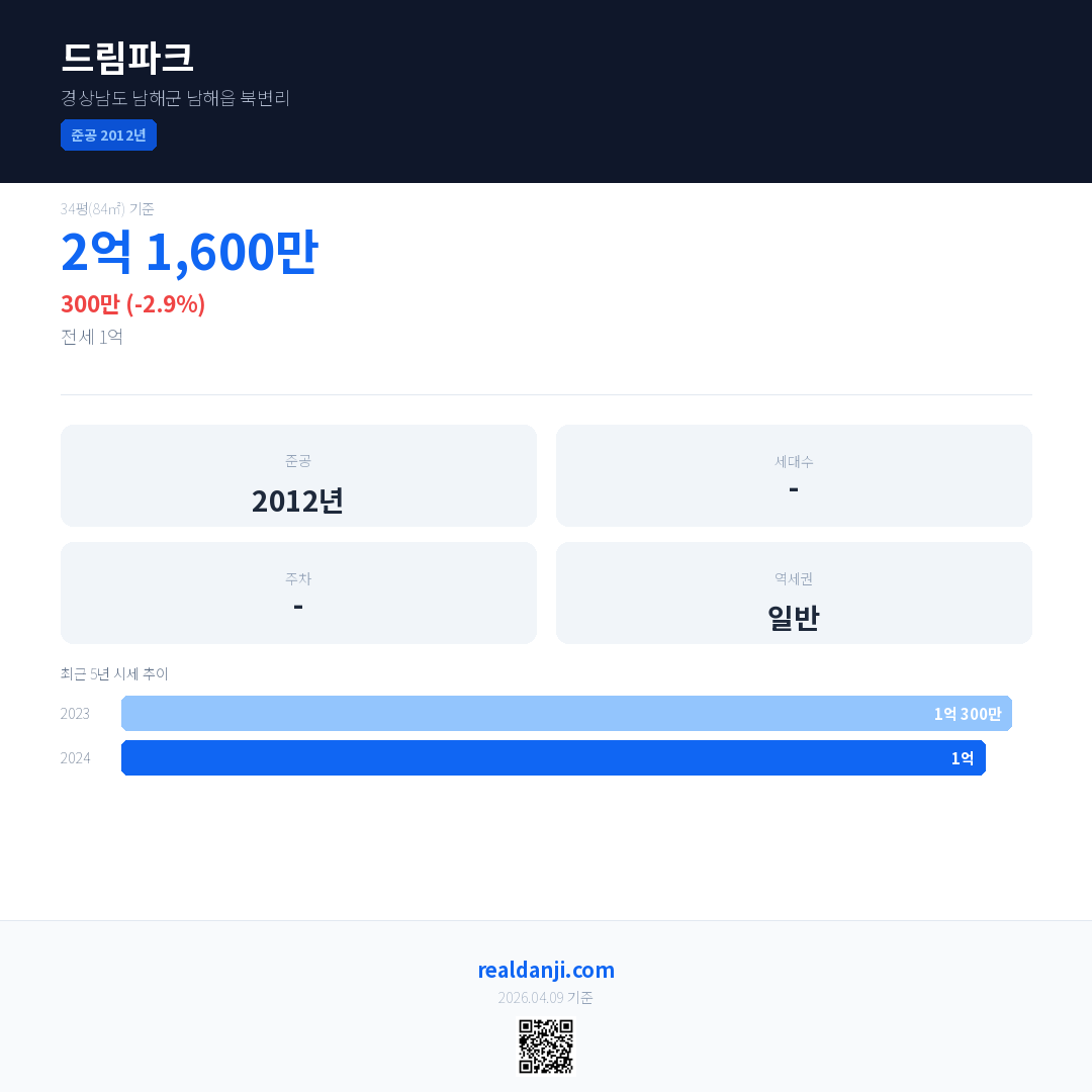드림파크 국민평형 기준 2024년 평균 거래가는 1억으로, 전년 대비 2.9% 하락 했습니다.